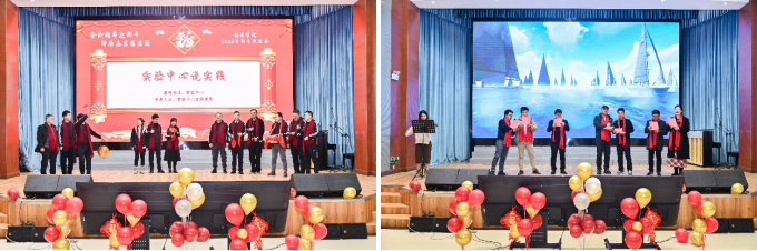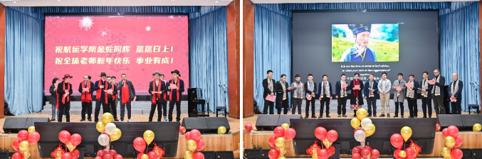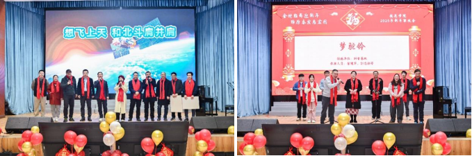 联欢会在海事系热情洋溢的《敬业阵线联盟》歌舞中拉开序幕,老师们将专业精神与热情活力完美融合,展现了对教师职业的热爱;导航系改编的歌曲《我相信》,怀揣着对未来的无限憧憬和坚定信念,激励着大家在新的一年里勇敢追逐梦想;航海系呈现的朗诵节目《出师表》不仅展现了古代智者的忠诚与担当,更与航海精神相得益彰;黄沙万里长,何处传来驼铃声,科普基地的老师们献上了一首充满历史沧桑与家国情怀的经典歌曲《梦驼铃》。
