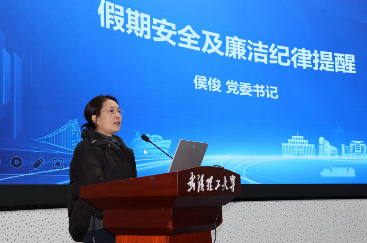 院党委书记侯俊就假期安全及廉洁纪律工作提出明确要求。她对实验室安全隐患排查、假期值班安排、留校学生管理等重点工作进行布置,明确了全体教职工假期期间的各项安全注意事项,特别针对酒驾、违反廉洁纪律等问题作出严肃提醒,要求大家严守纪律底线,筑牢安全防线。