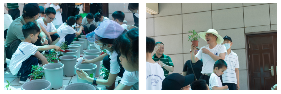 第三部分,“我爱劳动”小农场种植活动。在天象馆四楼露台上,孩子们在翁建军教授的示范下,铲土、种苗、浇水,种下一棵棵小西红柿、小辣椒苗,并在花盆上郑重贴上自己的姓名,进行植物认养,体验了一堂成就感满满的劳动教育课;家长们全程陪伴协助,与孩子们一起洒下劳动的汗水,亲子体验感满格。