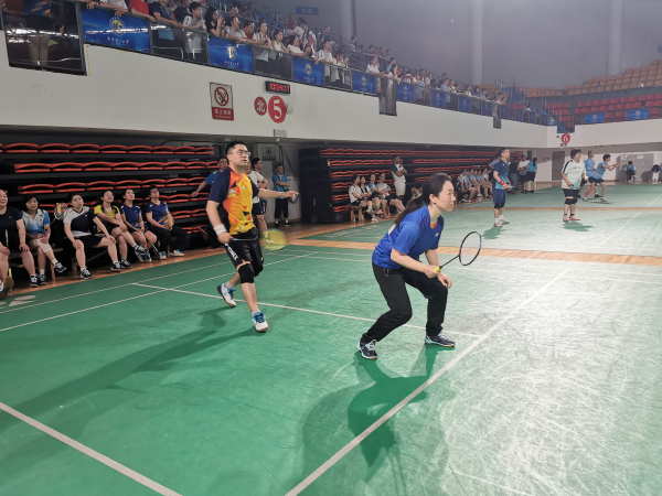 参赛队员们换上了轻松运动装变成了活力四射的运动员,尽显风采,将高远球、扣杀、劈杀、吊球等各路球技呈现得淋漓尽致,赛场下助威的啦啦队,喝彩声、加油声此起彼伏。竞赛中,每位参赛选手充分发挥坚韧拼搏的体育精神,即使落后,仍每球必争,绝不轻言放弃,竞赛胜败已不那么重要,奋力拼搏的精神充溢了整个赛场。