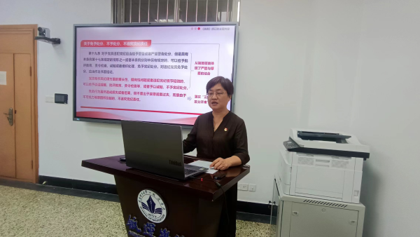 赵娟娟书记讲授纪律党课。她以《认真学习贯彻纪律处分条例,推动形成遵规守纪高度自觉》为题,围绕《中国共产党纪律处分条例》修订的历程、正确理解《条例》修订的背景意义及主旨要义、《中国共产党纪律处分条例》修订的主要内容三个部分,结合教育系统违纪案例分析和成人电影线上看当下正在开展的学校“智慧纪检”预警信息自查自纠工作,带领大家学习解读《条例》内容,提高学纪、知纪、明纪的自觉意识,不断增强遵规守纪的行为自觉。