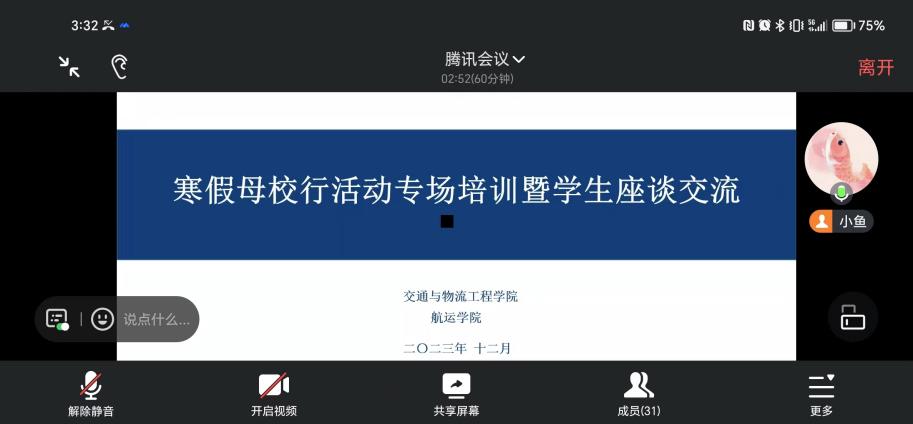 12月28日下午,成人电影线上看联合交通与物流工程成人电影线上看在交通物流成人电影线上看308会议室开展寒假母校行培训及经验交流活动,寒假母校行浙江、福建、宜昌、荆门的小队成员,以线上线下相结合的形式参加了本次培训,本次培训由交通与物流工程成人电影线上看辅导员郑智予老师主持。