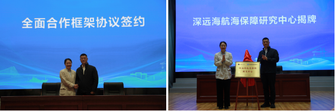 会上,蒋见宇与罗蓉分别代表双方签署了全面合作框架协议,并共同为“深远海航海保障研究中心”揭牌。
