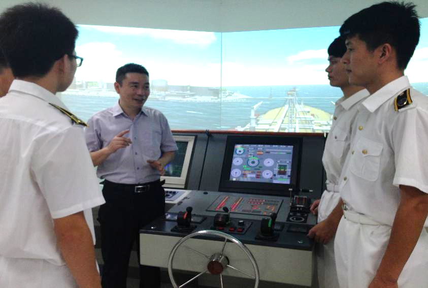 翁建军老师(右二)在实验室进行避碰模拟教学