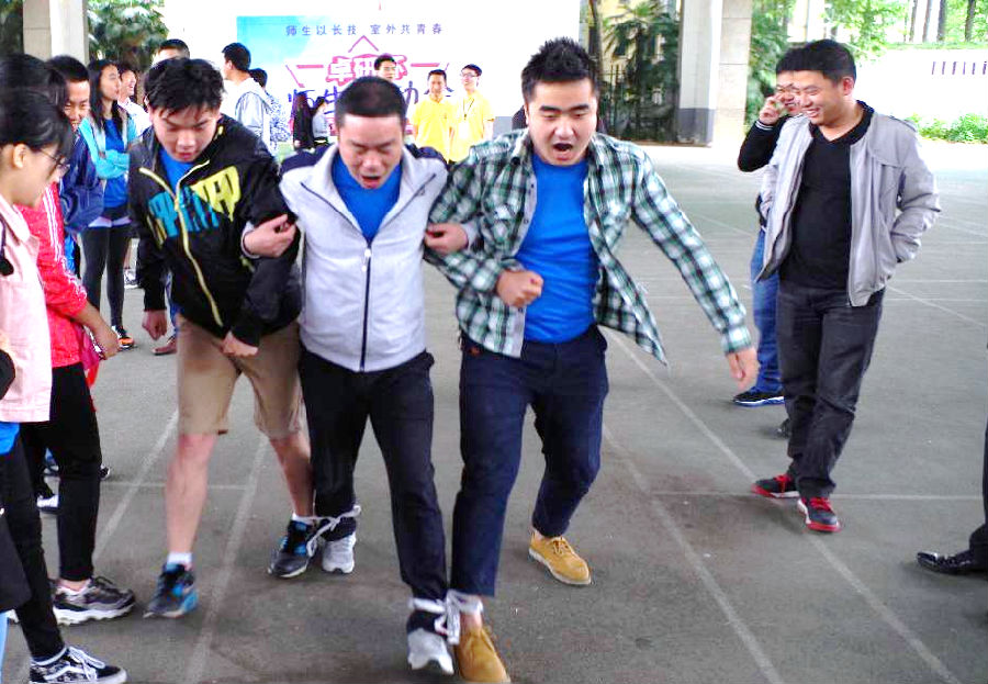 翁建军老师(前排中)与学生一起参加趣味运动项目
