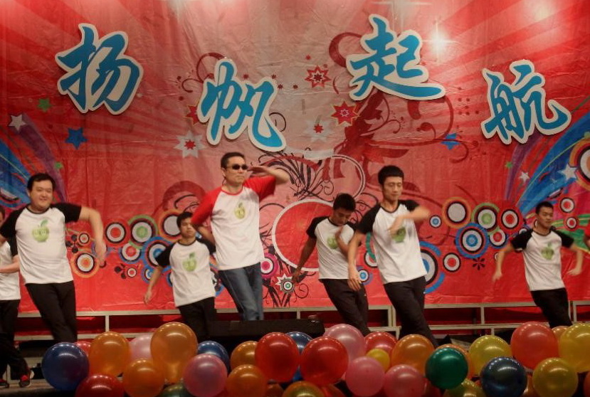 翁建军老师(前排中)和学生一起表演文艺节目